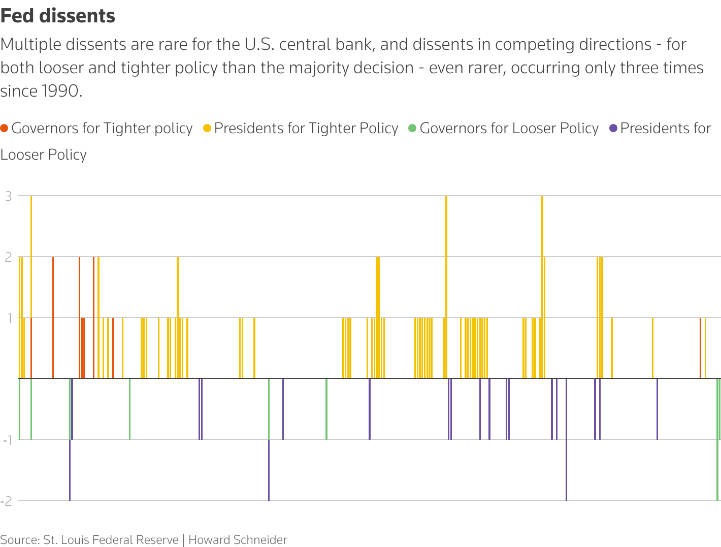 根据圣路易斯联储的数据,这是自1990年以来,美联储政策制定者第三次在不同的政策方向上同时出现异议票,这显然预示着美联储内部目前对经济走向存在巨大的意见分歧。